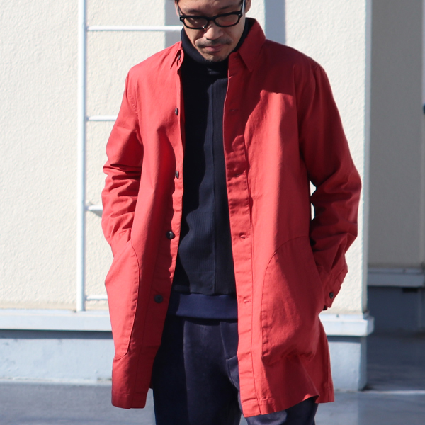 ワークコートのようなシンプルなフォルムに、アクセントになる大きめの四つ穴釦を排しています。