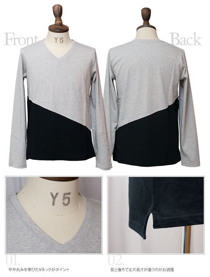 斜めに切り替えの入った大胆なバイカラー仕様のVネックT。