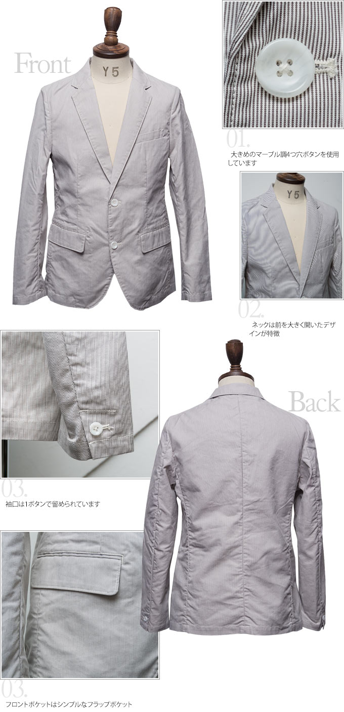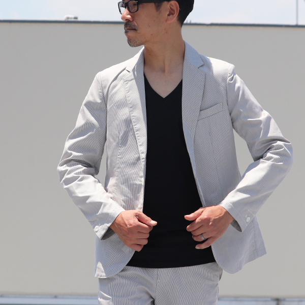 グレー×ホワイトカラーはもちろん、ブラック×チャコールカラーも独特の生地感のお陰で、爽やかで軽い印象をあたえるジャケットです。