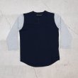 落ち着いた色合いの無地のスウェット地を袖で切り替える、ベースボールシャツのデザインに仕上げました。