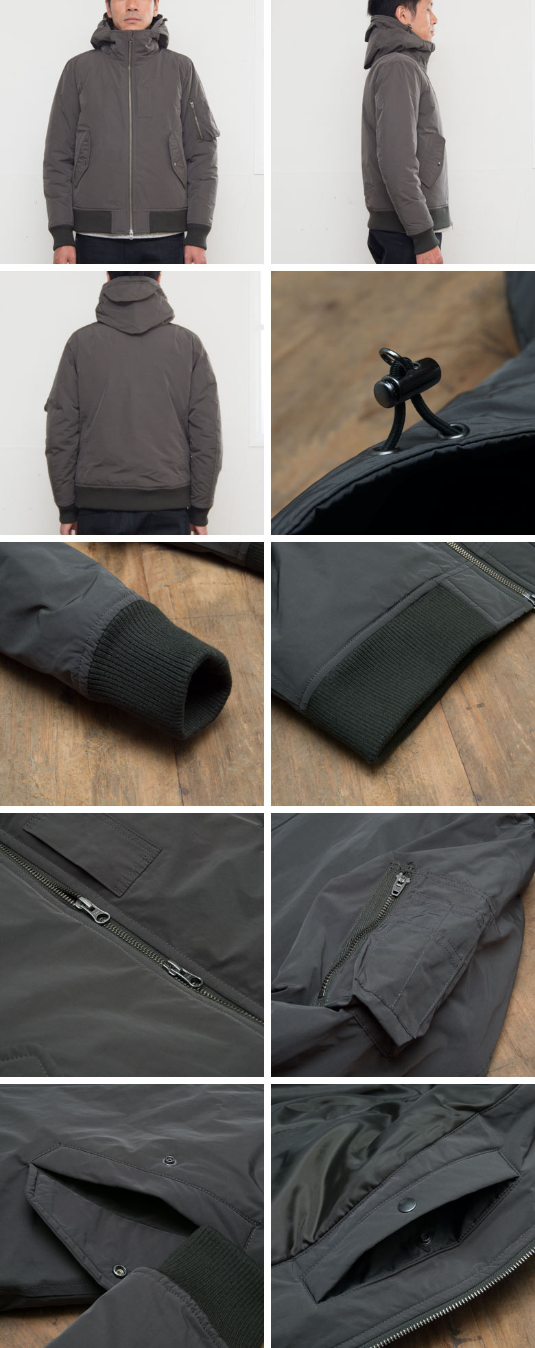 ミリタリー感の強いMA1ですが、アーム部分を細く、ボディのボリュームを程よく抑えたスマートな仕上がりのフード付きブルゾンです。