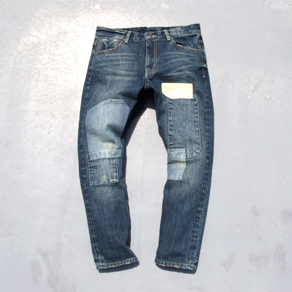 ヴィンテージデニムの魅力の一つとして挙げられる"セルヴィッチ(赤耳)"。そのセルヴィッチデニムをベースに一本のデニムを何年も当て布しながら使い続けたかのようなヴィンテージ加工を施しました。