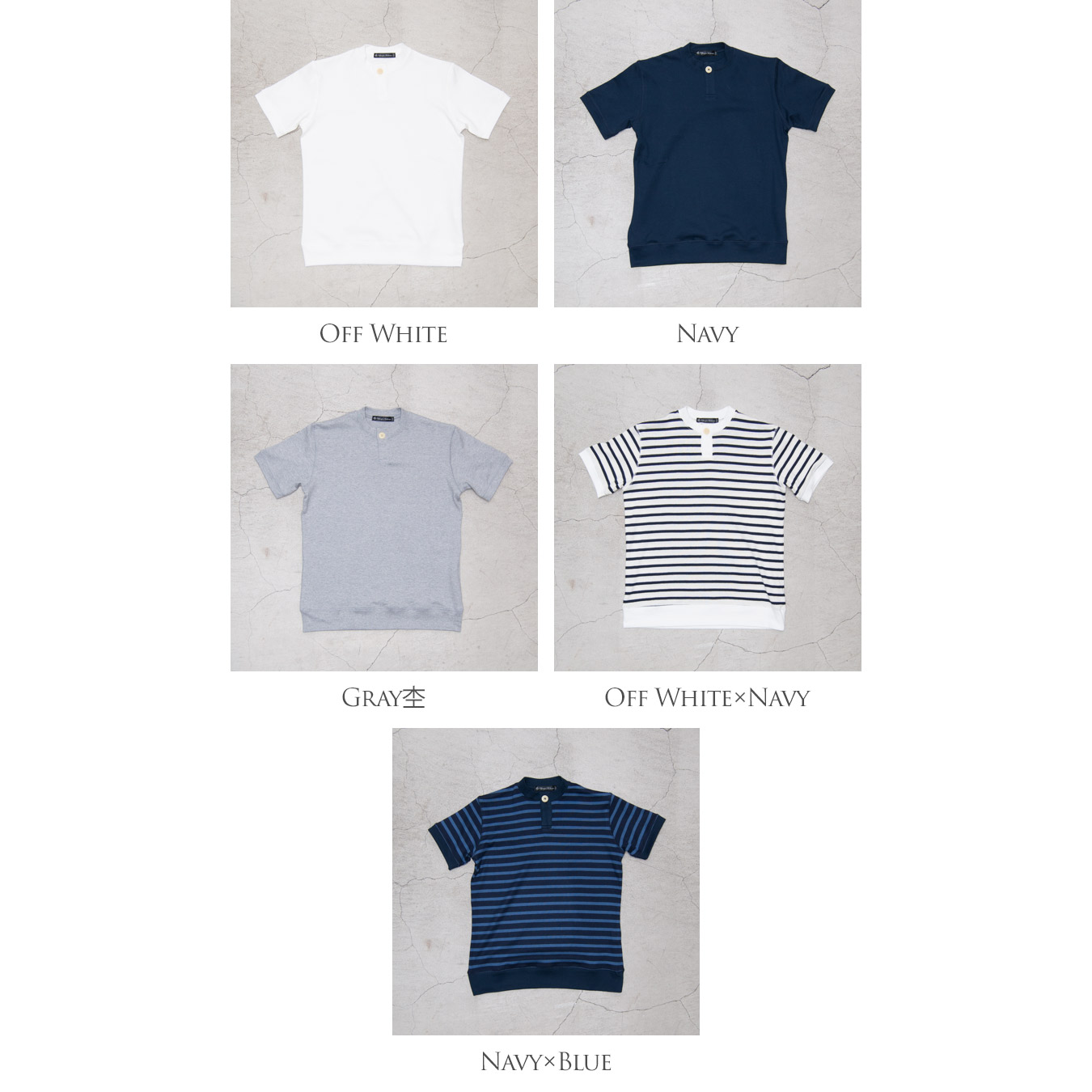 柔らかな肌触りと軽い着心地が特徴的なセーターライク天竺を使用した、1ボタンヘンリーネックカットソー。