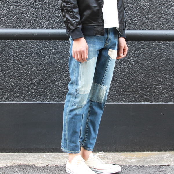 生地自体へのウォッシュ、リペア加工とスッキリとしたアンクルシルエットが絶妙なバランスで融合しています。