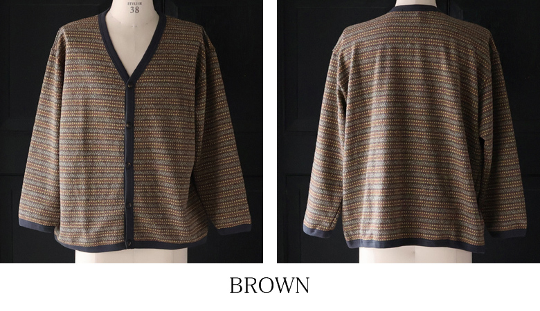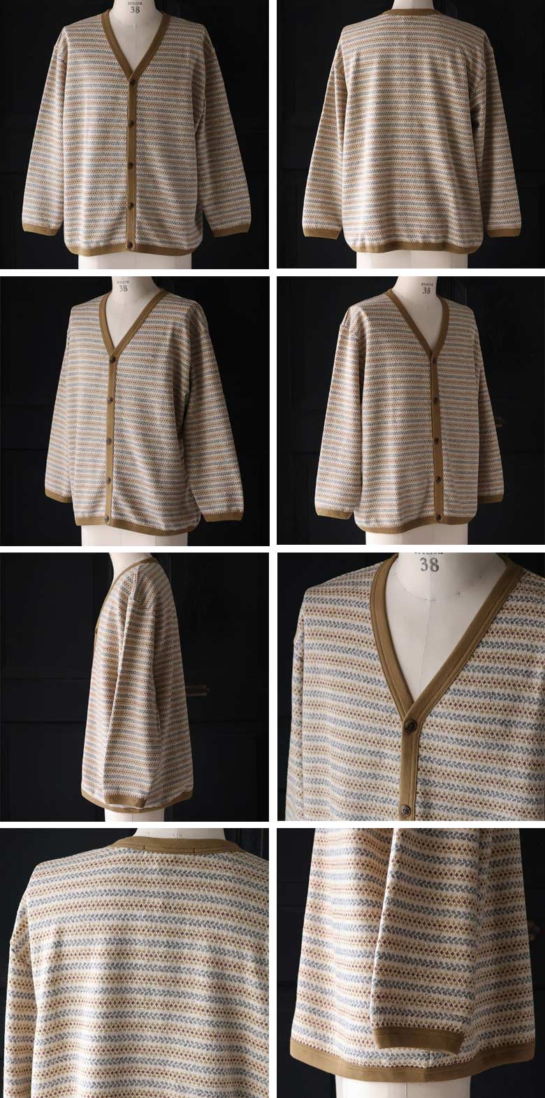 デザインとしては、Vネックで、首元、前立て、裾、袖は全てリブ仕様にて、マルチカラーの良さを生かす、クラシックなデザインです。