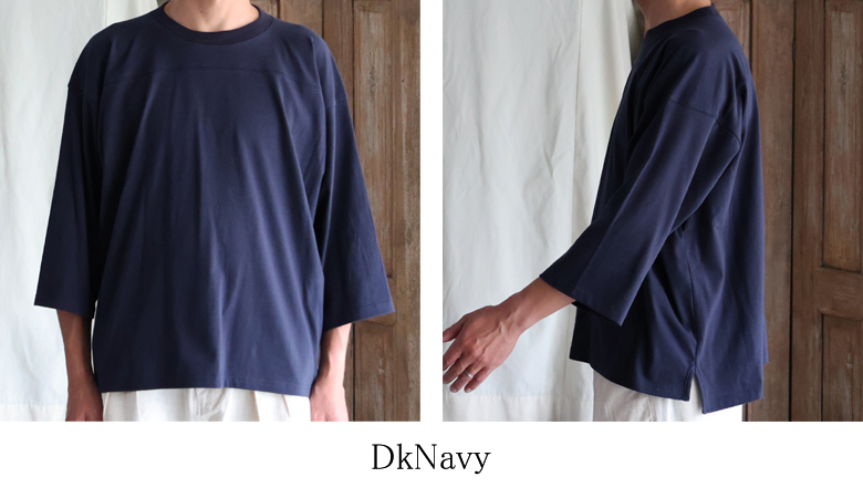 フットボールシャツのような胸の切り替えラインが特徴の7分袖Tシャツです。