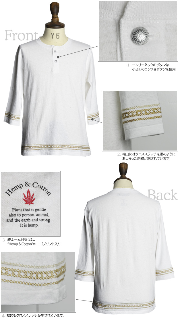 ヘンプコットンクロスステッチコンチョボタンヘンリーネック7分袖カットソー / Audience [AUD1322]