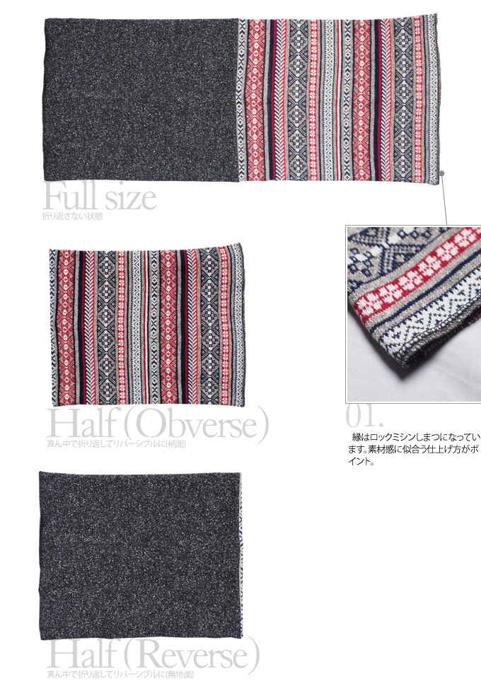 | MATERIAL | (柄部分)コットン53% アクリル33% ポリエステル14% (無地部分)アクリル40% コットン30% ポリエステル30% |