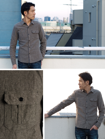 ネコ目ボタン、二段になった胸ポケット、右胸の隠しポケットなどワークシャツの定番デザインを踏襲し、素材の魅力をシンプルに活かしました。