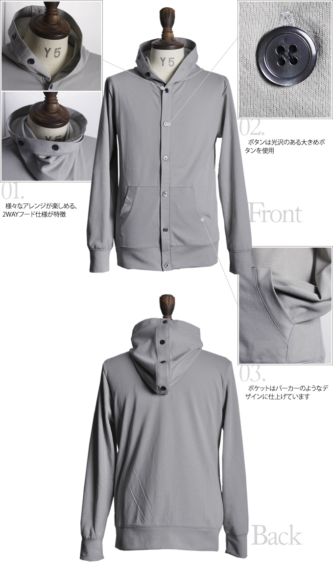 おおよそカットソー素材に求められる機能性を高い次元で兼ね備えたエアレットプロ素材を、個性的なスタイルが楽しめる2WAYフードのカーディガンに仕上げました。