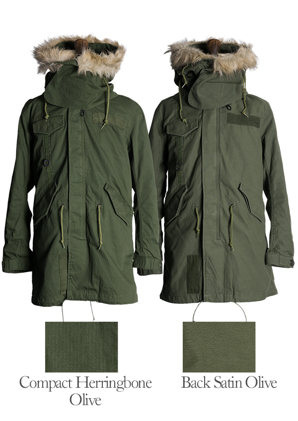 モッズコートと言えばオリーブ色ですが、今回は2素材でオリーブ色を展開。“く”の字の細かなうねとやや深めのオリーブ色の“Compact Herringbone Olive”、褪せたような色合いとムラがリアルな“Back Satin Olive”の2カラー展開。/p>