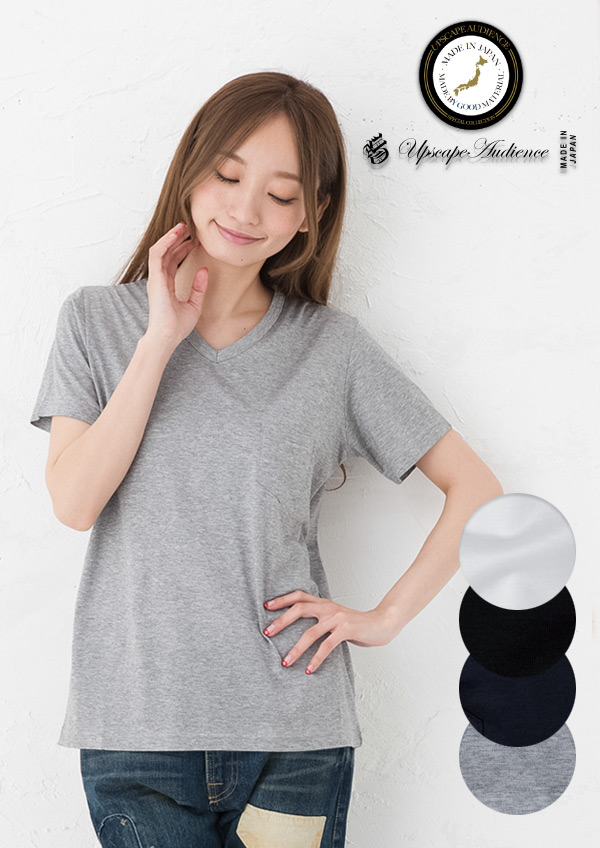 【RE PRICE / 価格改定】ナノシア汗止め加工プライマリー天竺Vネックポケット付き半袖カットソー [Lady's]【MADE IN JAPAN】『日本製』/ Upscape Audience [AUD1556]