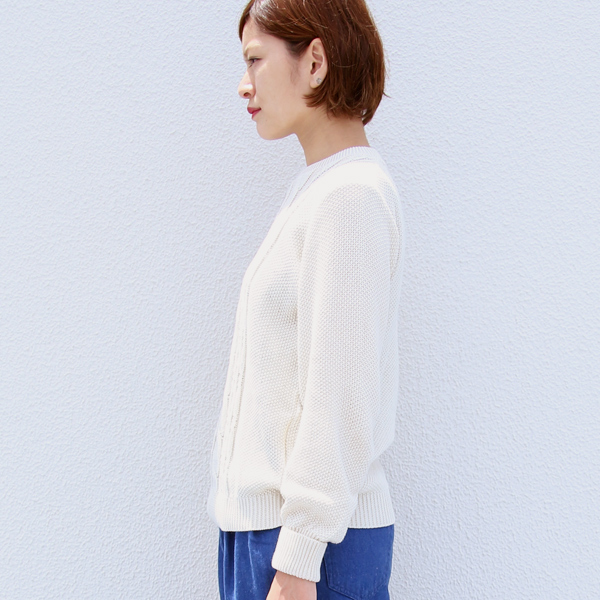地は鹿の子でさらりと、柄はケーブル編みで見た目に暖かでナチュラル。着心地と、スタイルを両立するこだわりの仕上がりがポイントです。