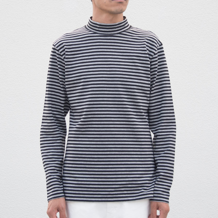 綿に絹のような光沢を与えるシルケット加工が施されたボーダー柄素材を使用したモックネックカットソー。