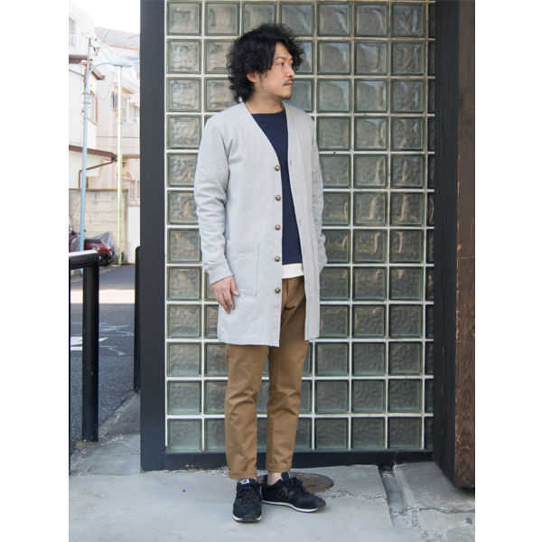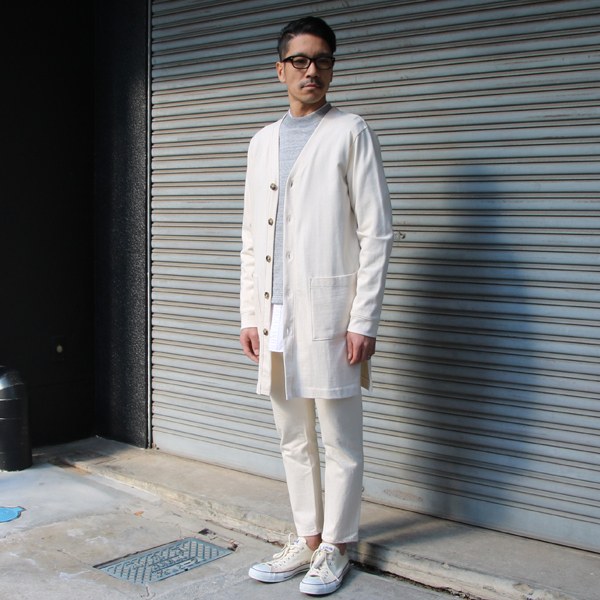 風合い良い中肉のカットソー素材、"BSQソリッド"地を使用したロングカーディガンコート。