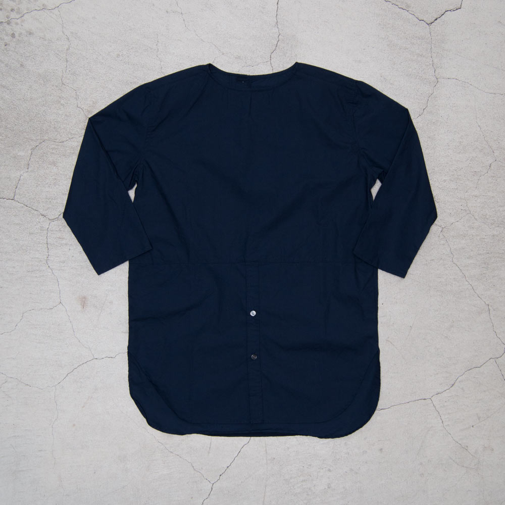 クルーネックの首周りをフロントで切り替え、裾はスタンダードなボタン留めのシャツのスタイルを踏襲。ややオーバーサイズ&ロング丈にまとめ、ゆったりとしたスタイルは暑苦しく見えないデザインです。