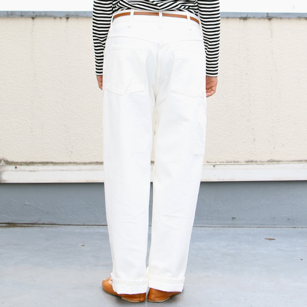 ホワイトデニムらしい清潔感と、洗い加工の柔らかさを兼ね備える質感が大きなポイントです。