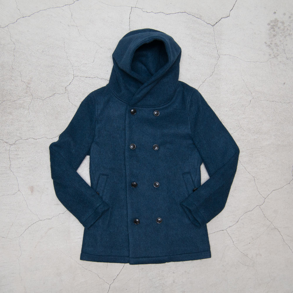 Pコートのデザインにショールカラーとフードを加え一般的なPコートとは異なった遊び心を感じられるアイテム。