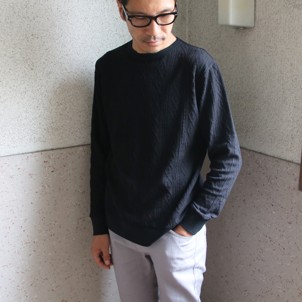 ローゲージのようなケーブル編みとハイゲージのような細かく密に編まれたような着心地が混在する1枚です。