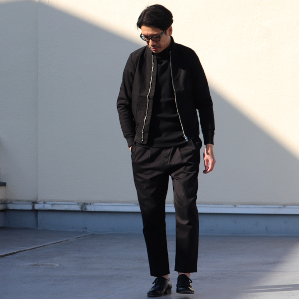 シンプルにまとめた事で、ヘビーオックスの素材感や同系色で切り替えたリブの存在感が際立っています。