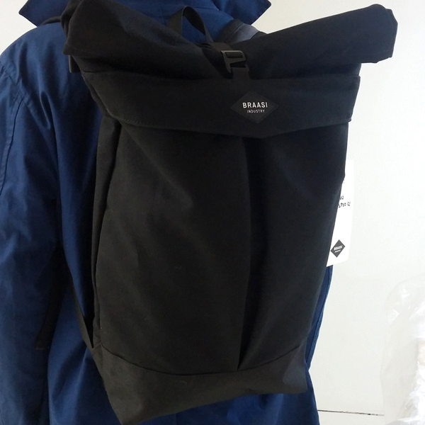 フロント部分に装備されるフラップ付きの2つの縦長ポケットが印象的で、アッパー上部はBRAASI社オリジナルのメタルパーツ(Gフック)でロールトップを留める事が出来ます。