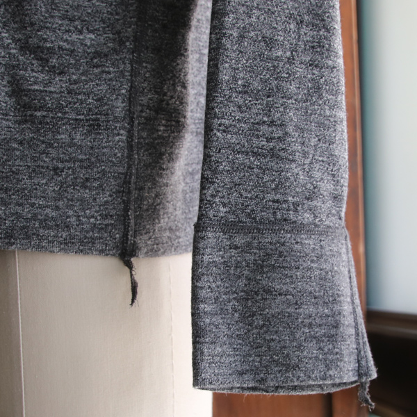 ヴィンテージの世界観を忠実に、当時の生産背景まで意識したディテールにする為に、脇の縫製の袖先と裾先には、縫い糸をそのまま残す空環(カラカン)仕上げとなっております。