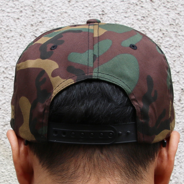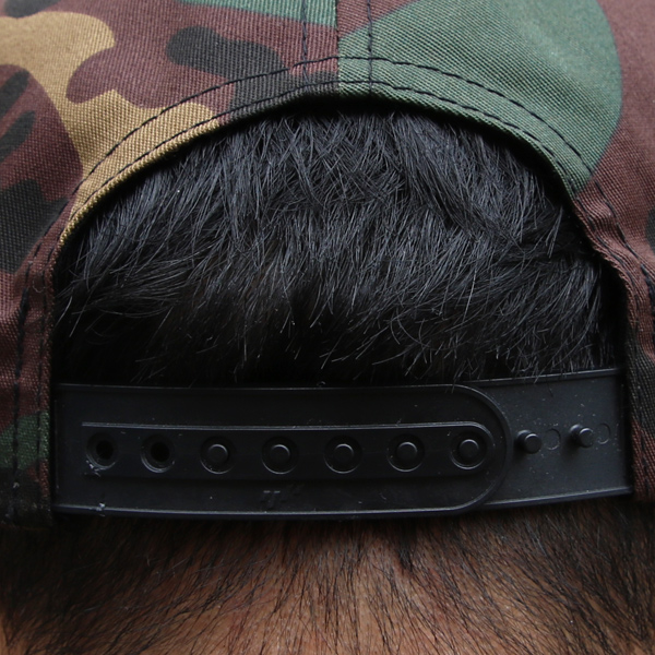 キャップはスナップパックで、アジャスタブル仕様で後ろでサイズ調整できるベルト(バンド)付き。