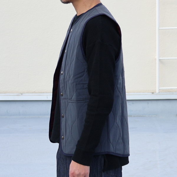 ミリタリーアウターのライナーに起用されているウェーブキルトのスナップベスト。