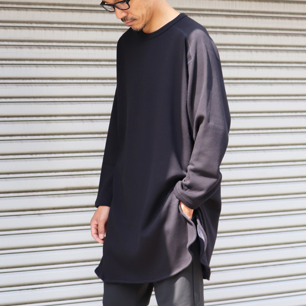 続いては、シルエット。前身頃はスプリットスリーブ、後ろ見頃はラグランスリーブです。肩周りを着心地を確保しながら、肩の曲線を落とし過ぎない、独特なシルエットになっております。