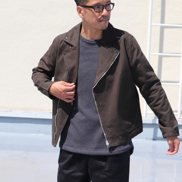 ライダースと言えばレザー素材を用いた多い中で、この素材の柔らかみのある生地感はハードな印象を押さえ着合わせやすい1着。