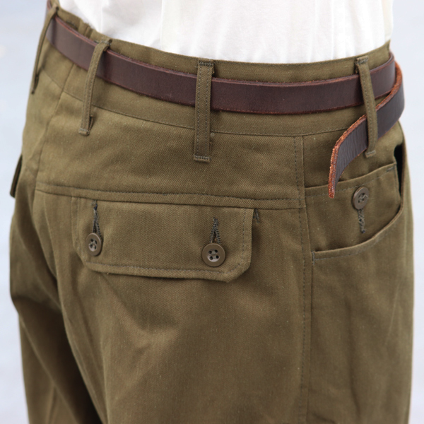 カーゴポケット、バックポケットはボタンむき出しの仕様にて見た目にもカッコ良いアクセント。
