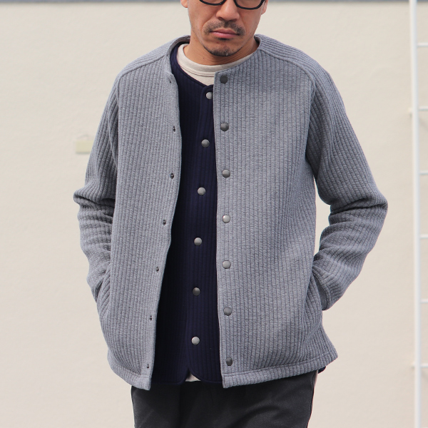 カーディガンに比べて、ノーカラーのライナージャケットとして、ジャケット感が更に強くなっております。