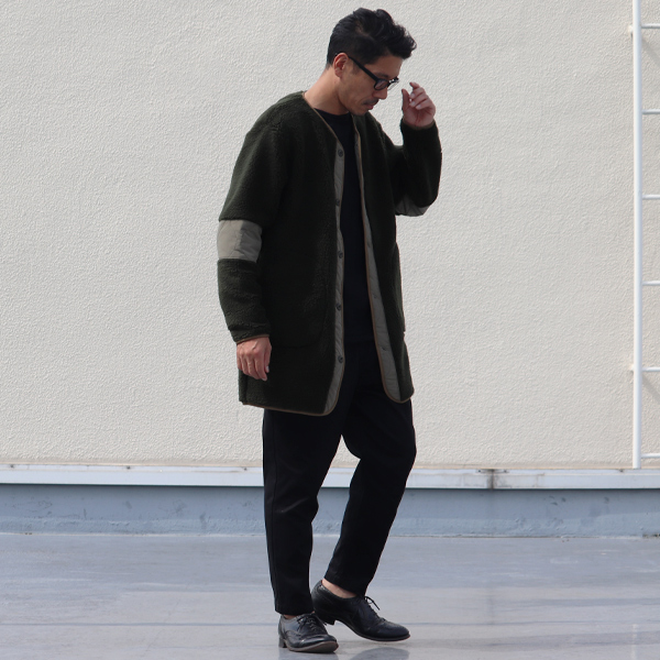 ノーカラーの見た目がすっきりとした印象のこちらのコートはUS ARMYで使用されるコートのライナーイメージがファッショナブルな印象を醸し出します。