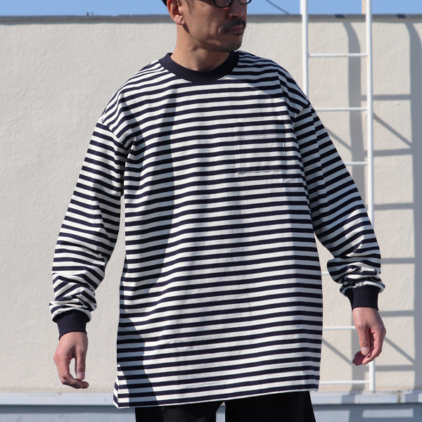 無地のタイプで好評を博したゆったりシルエットのクルーネック長袖TEEにボーダーの仲間入りです。