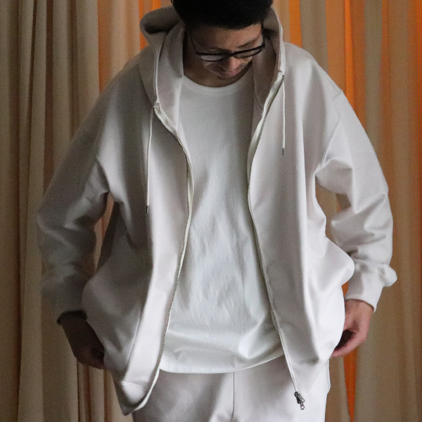 超厚手の裏毛のジップアップフーディーは、袖や身頃のパターンをアウター同様の身体のラインにしっかり沿う立体的な裁断にすることで、アウター感覚でもお使いいただける高級感のある仕上がりです。