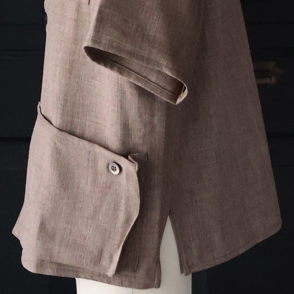 ドライタッチでイージーケアなリネンライク素材のノーカラー ハーフスリーブ ジャケットです。