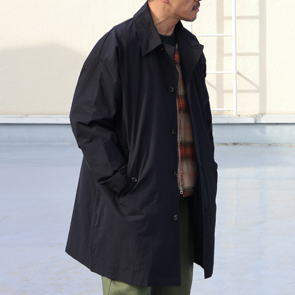 綿ナイロンポプリンを使用した、包み込んでくれるようなシルエットのステンカラーコートです。