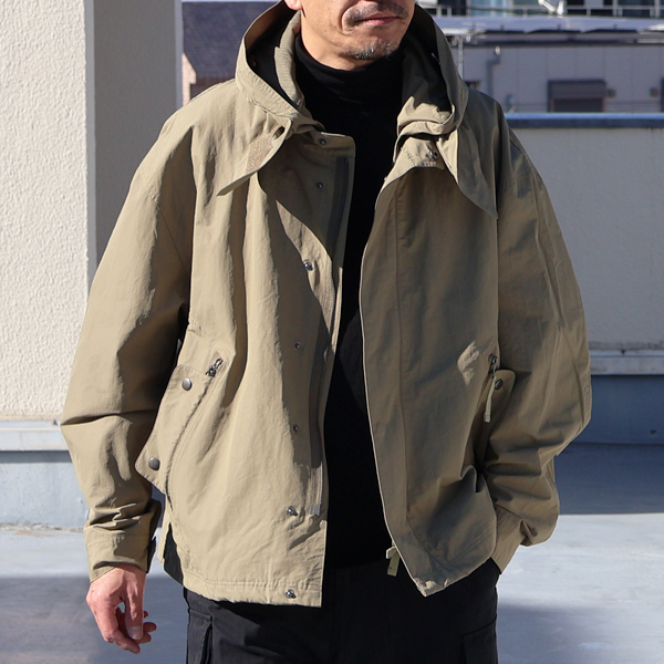 フードは脱着式になっているので、スタンドカラーのライトアウターとしても着用可能です。