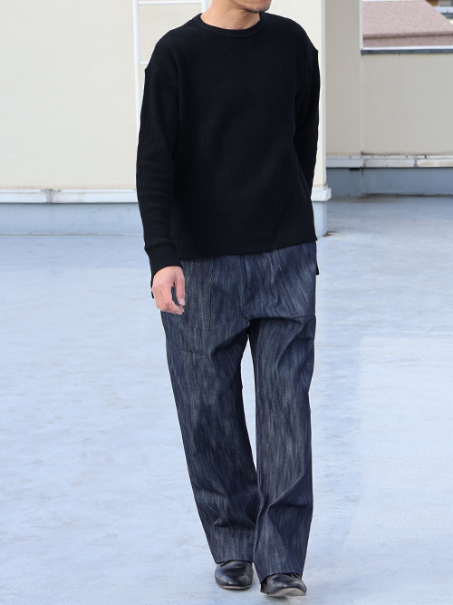 一見、ルーズ目なシルエットは裾にかけてのカットが秀逸で、ジャストで履くのは勿論、オーバーサイズをウエストで絞って履く事により、よりワイドなシルエットをお楽しみ頂けます。