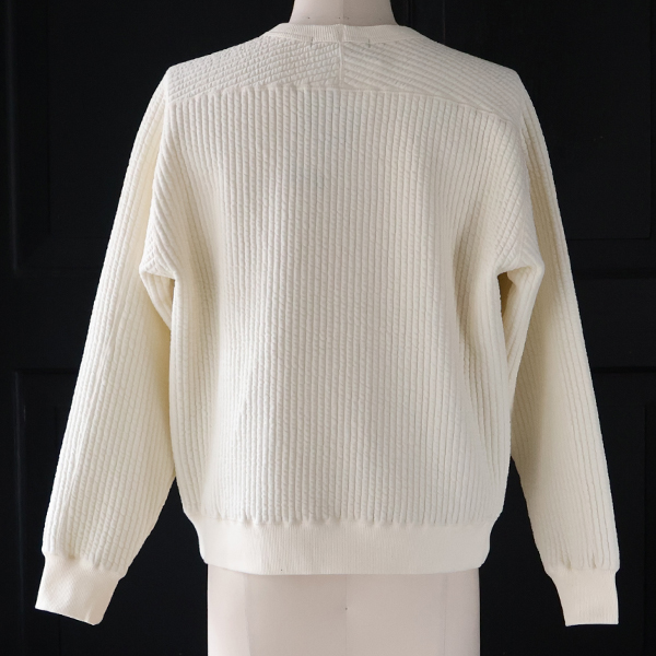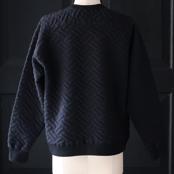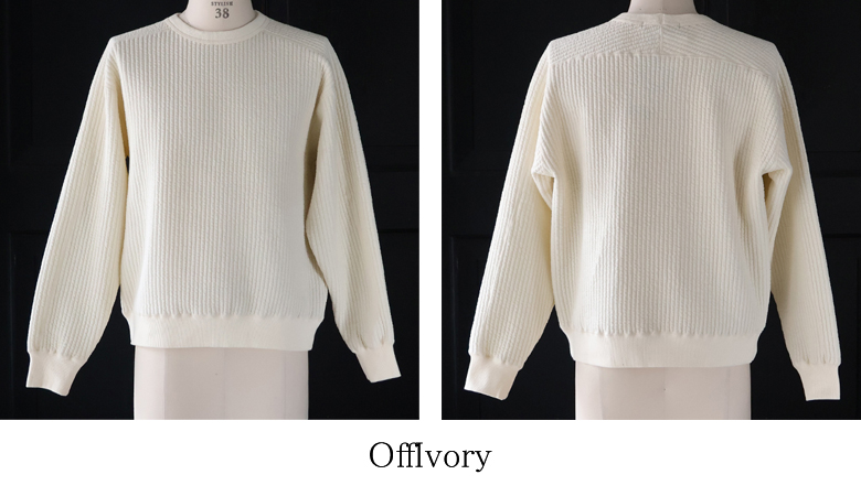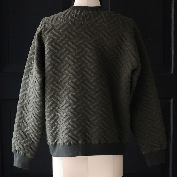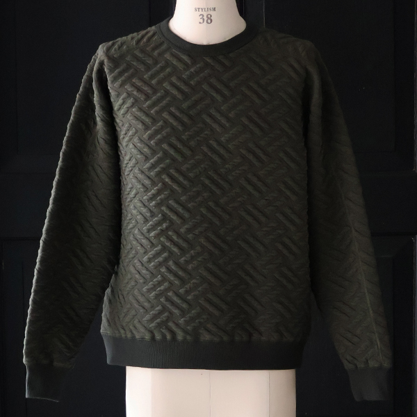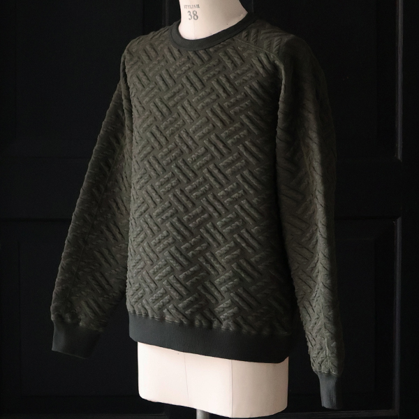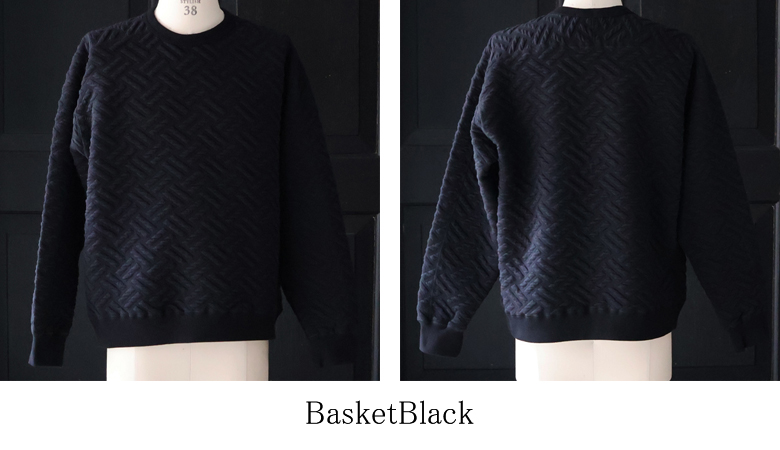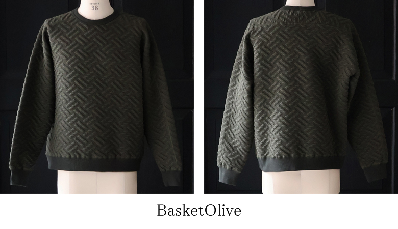 バスケット柄は、手編みのバスケットの網目を表現しています。ニットよりも手軽に着られる、丈夫でロングシーズンお楽しみいただける素材です。