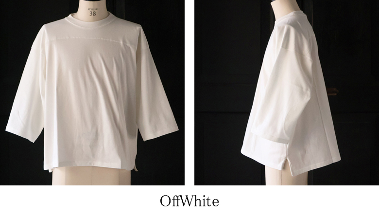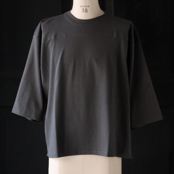フットボールシャツのような胸の切り替えラインが特徴の7分袖Tシャツです。