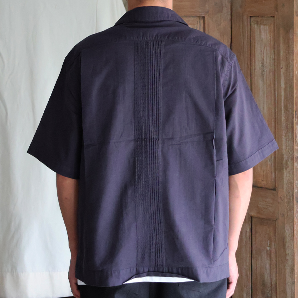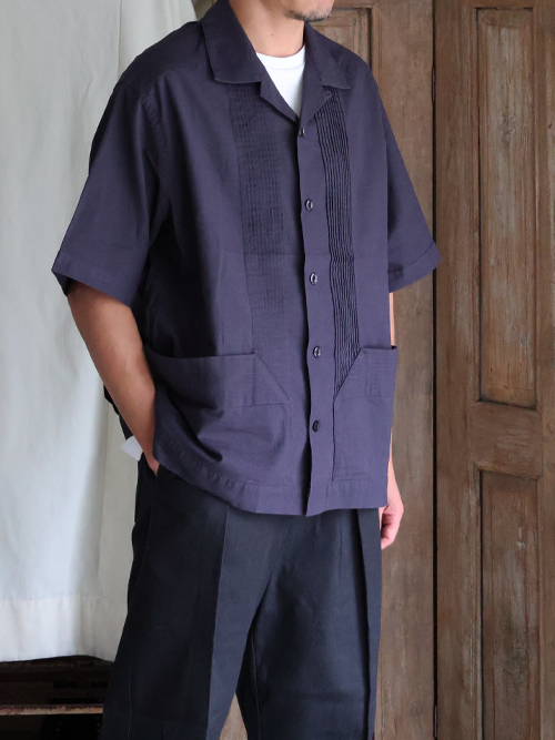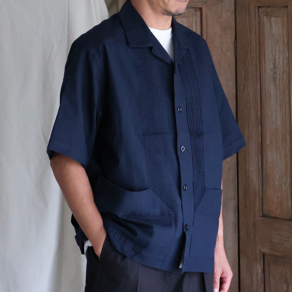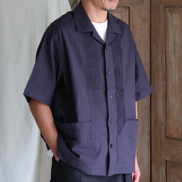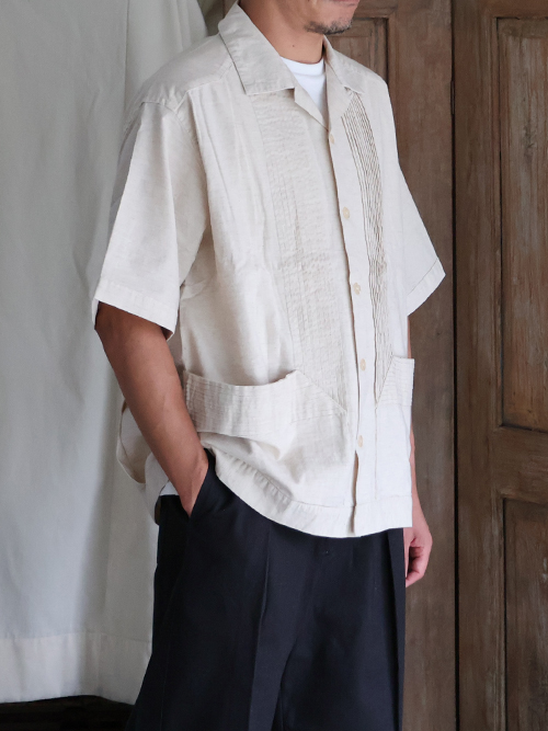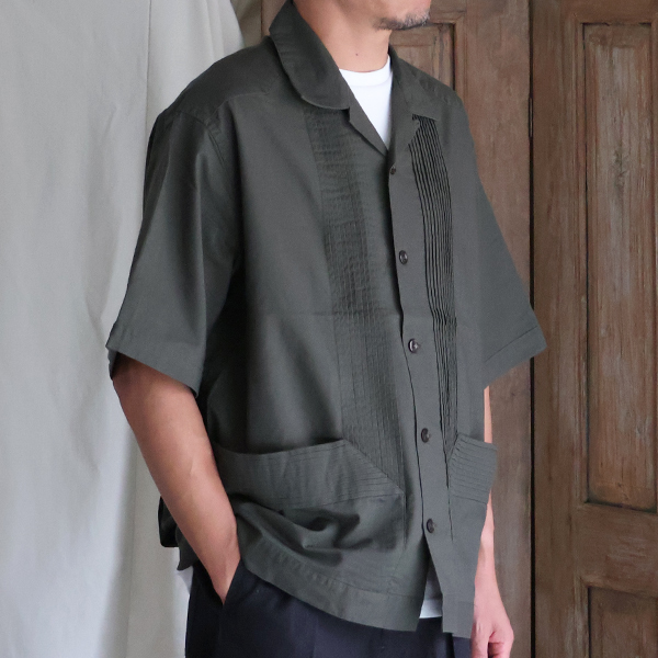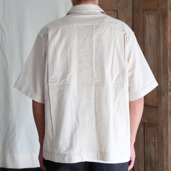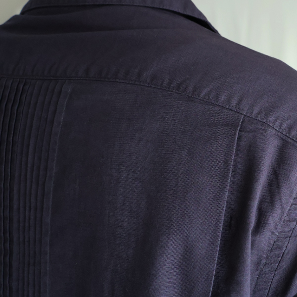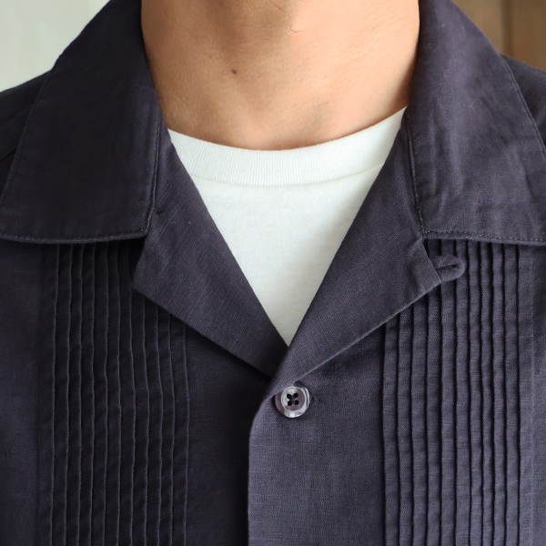 仕様としては、フロントとバッグにピンタックを施したクラシカルな仕上がりのオープンカラーシャツです。