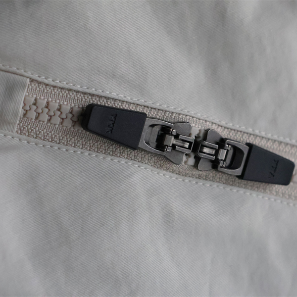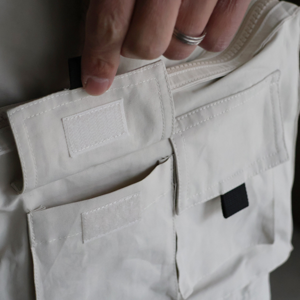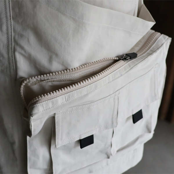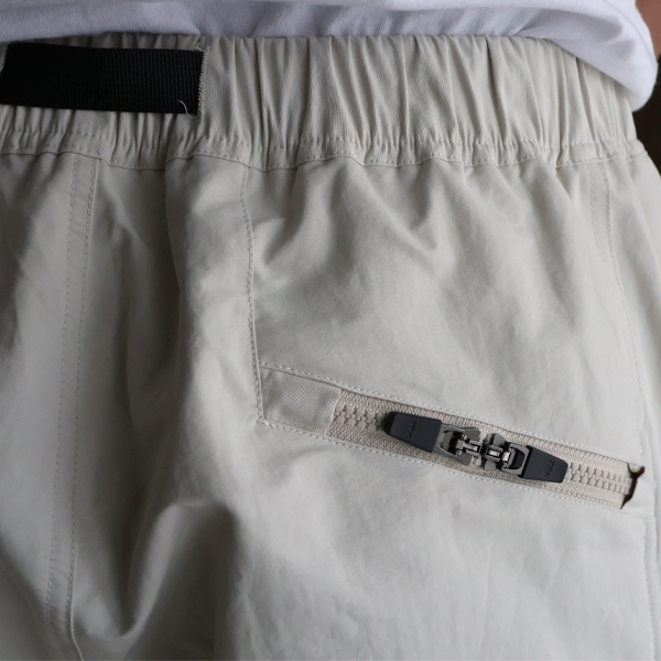 今作では、利便性を高めるジップフロント仕様を採用。ウエストはゴムと強固なグログランテープベルトを完備しました。