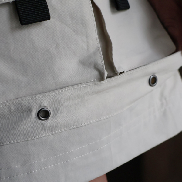 雨や雪といった悪天候時には、6割のコットンが膨張して生地の伱間を埋め、生地全体の密度が増します。残り4割のナイロンはもともとの性質上、水を弾き、風をシャットアウトしてくれ、撥水性と防風性を備えた、〝機能素材〟になります。