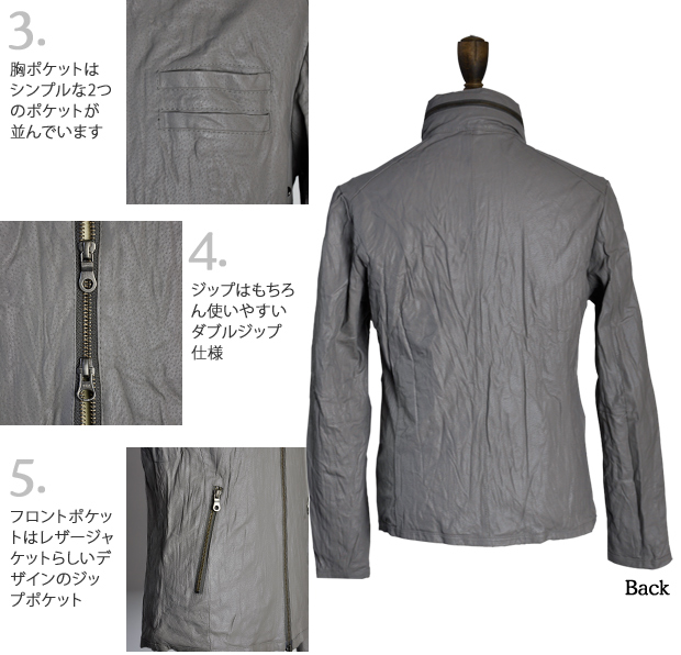 | MATERIAL | (表地)豚革 (胴裏)ポリエステル65% コットン35% (袖裏)ポリエステル100% |