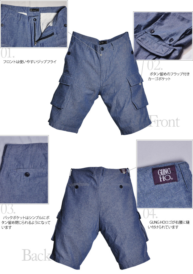 爽やかな色合いとさらりとした生地感が、蒸し暑い季節にはぴったりのシャンブレー素材を使用したカーゴショーツ。