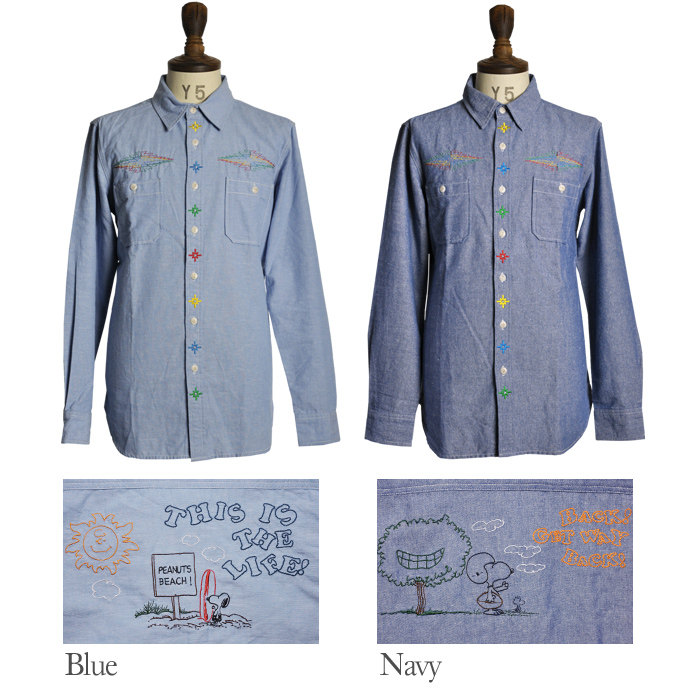 凹凸のある質感を持つ、タンガリー生地の長袖シャツをベースに、フロントはネイティブ柄&ビーズ、バックにはスヌーピーの刺繍を施されているのが特徴。